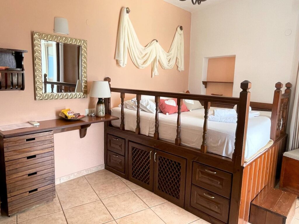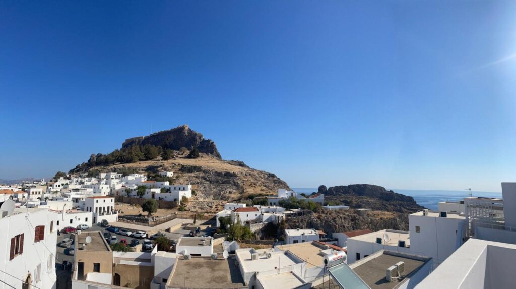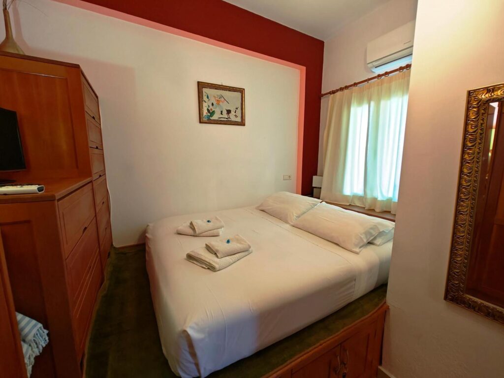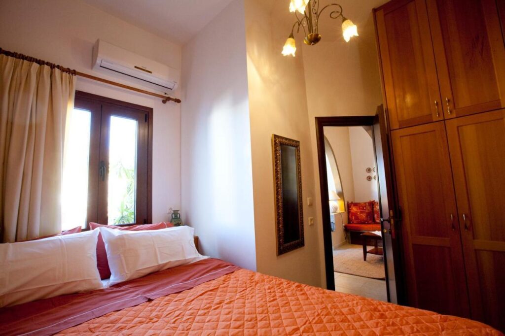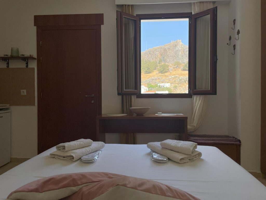 Opening to a common courtyard, the studios and apartments are traditionally decorated with built-in sofas and traditional Lindian wooden beds.