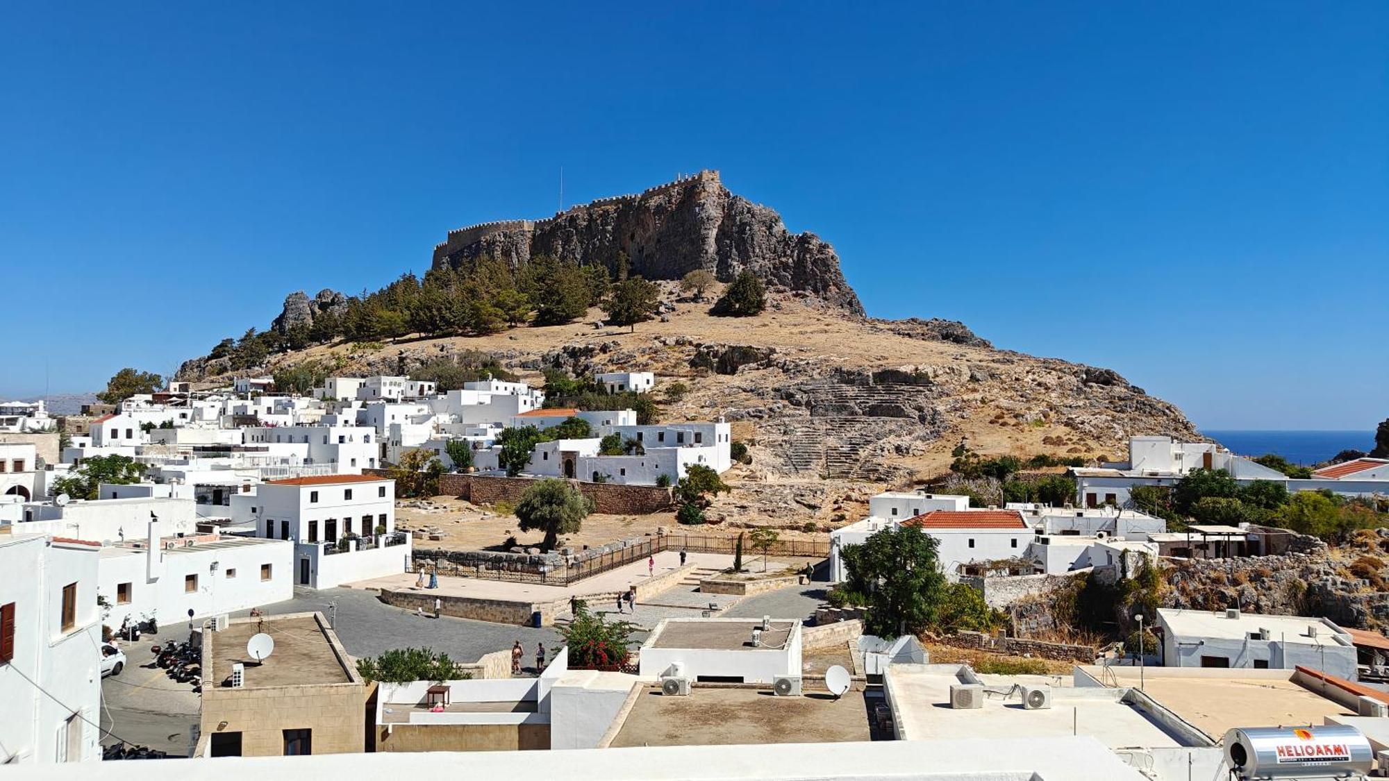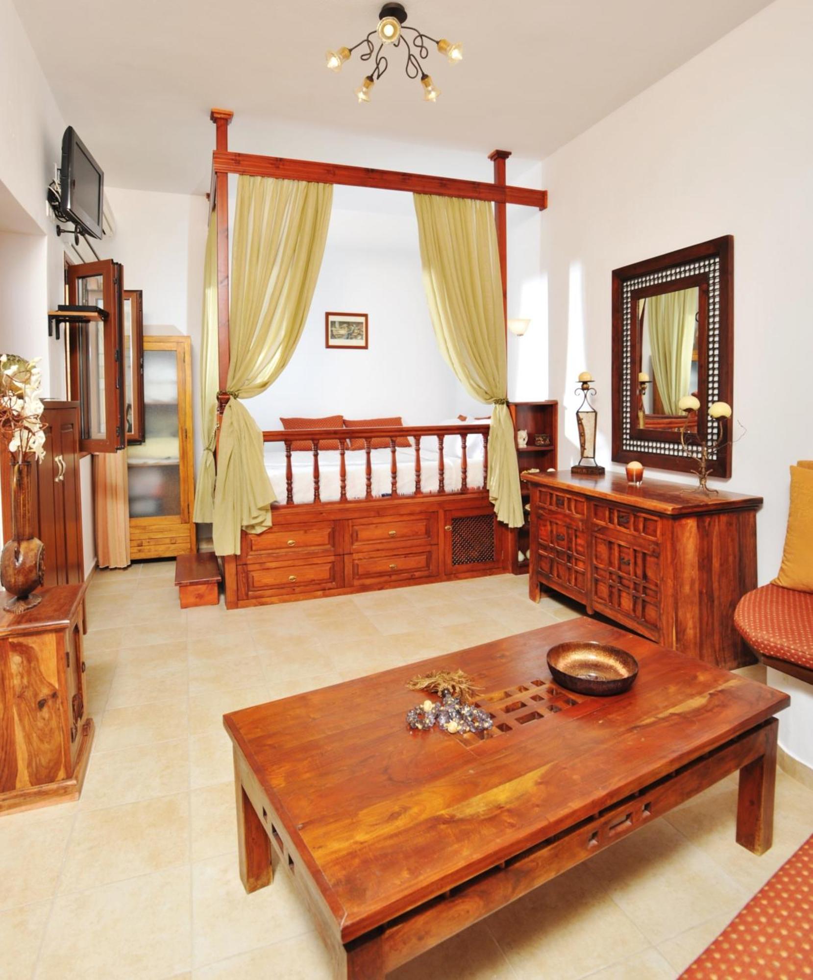 Opening to a common courtyard, the studios and apartments are traditionally decorated with built-in sofas and traditional Lindian wooden beds.